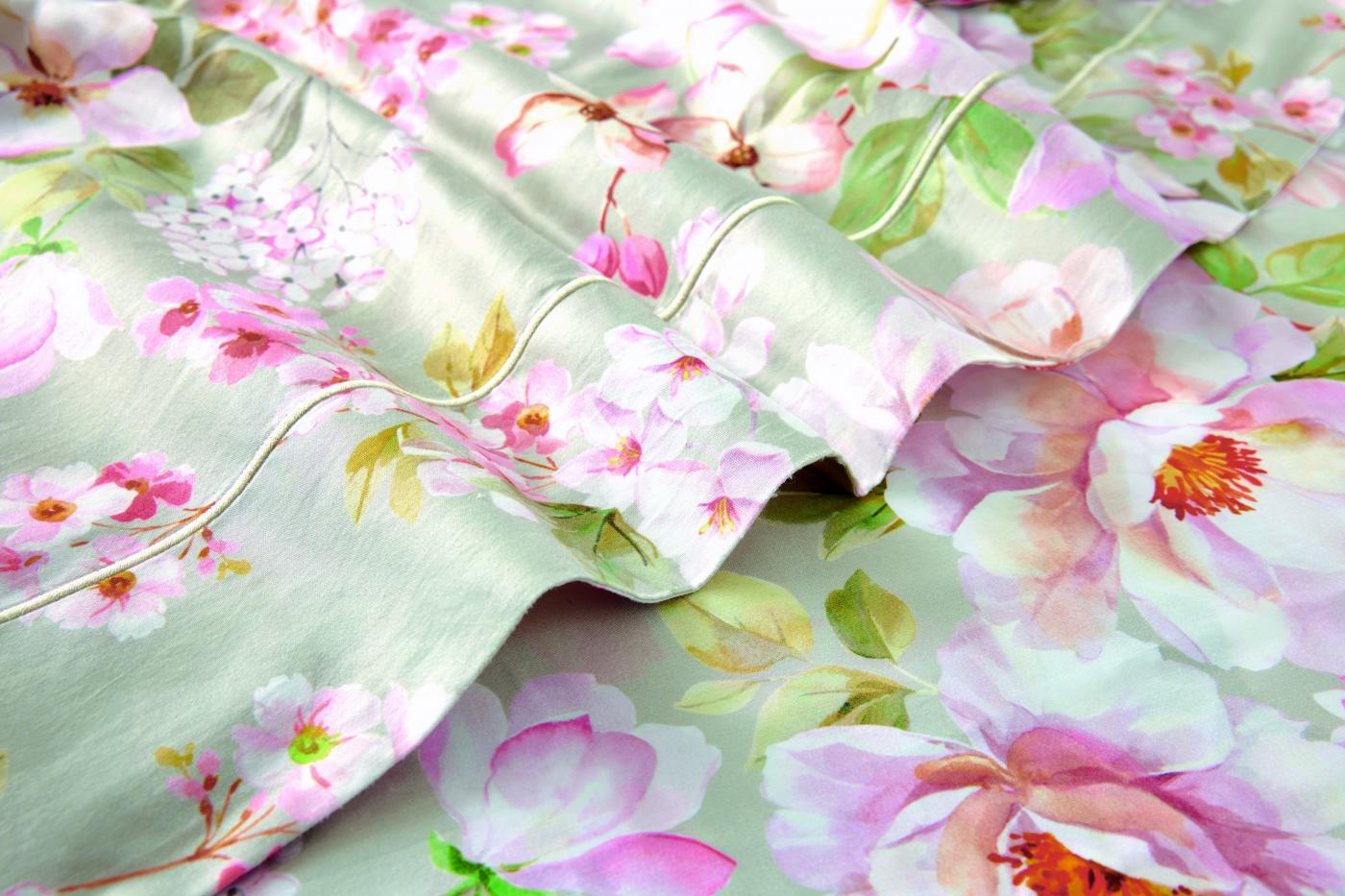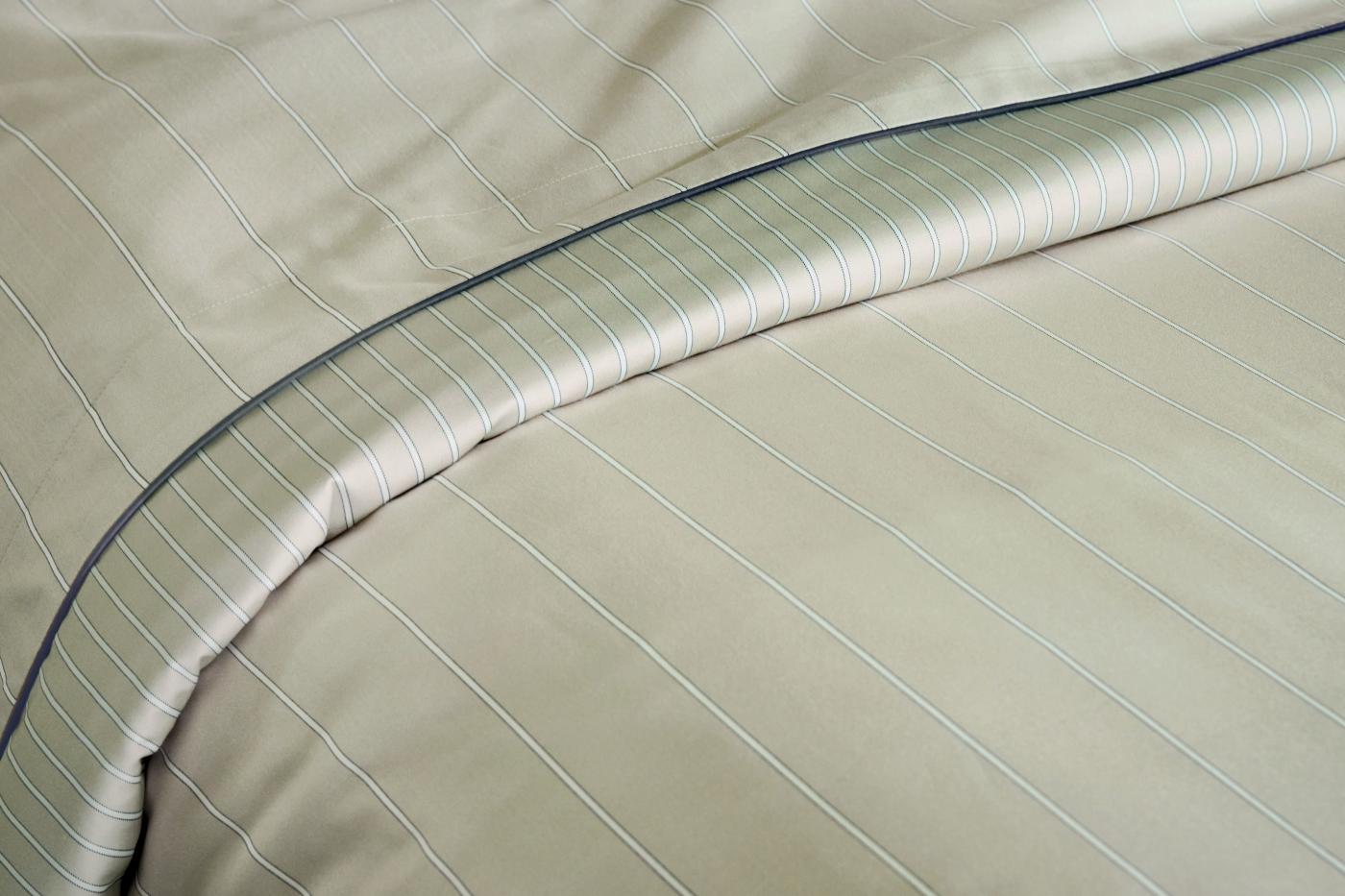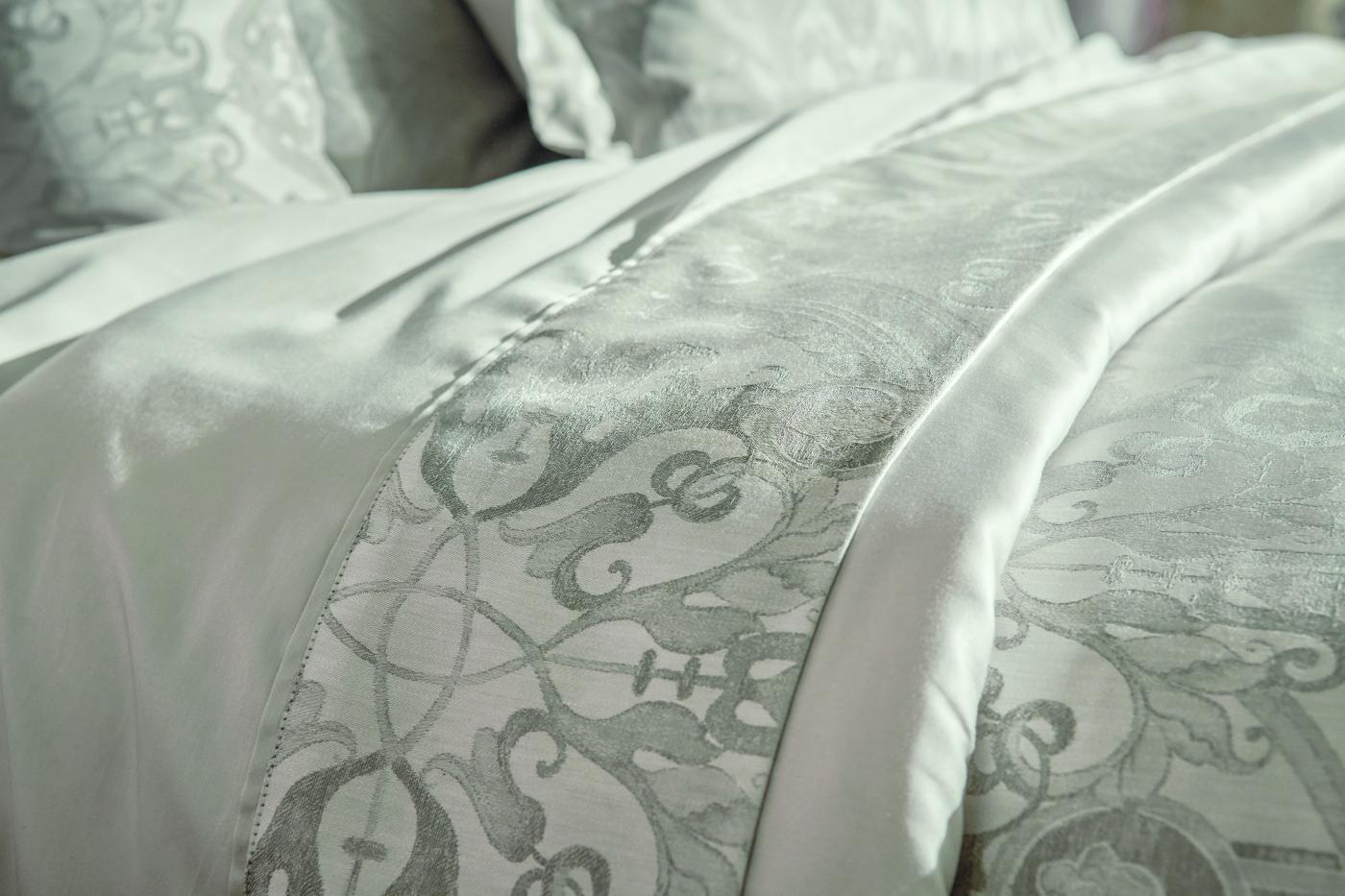 Loin des tonalités franches et tranchées, la parure de lit Brume affiche une atmosphère d'intimité, discrète et apaisante.